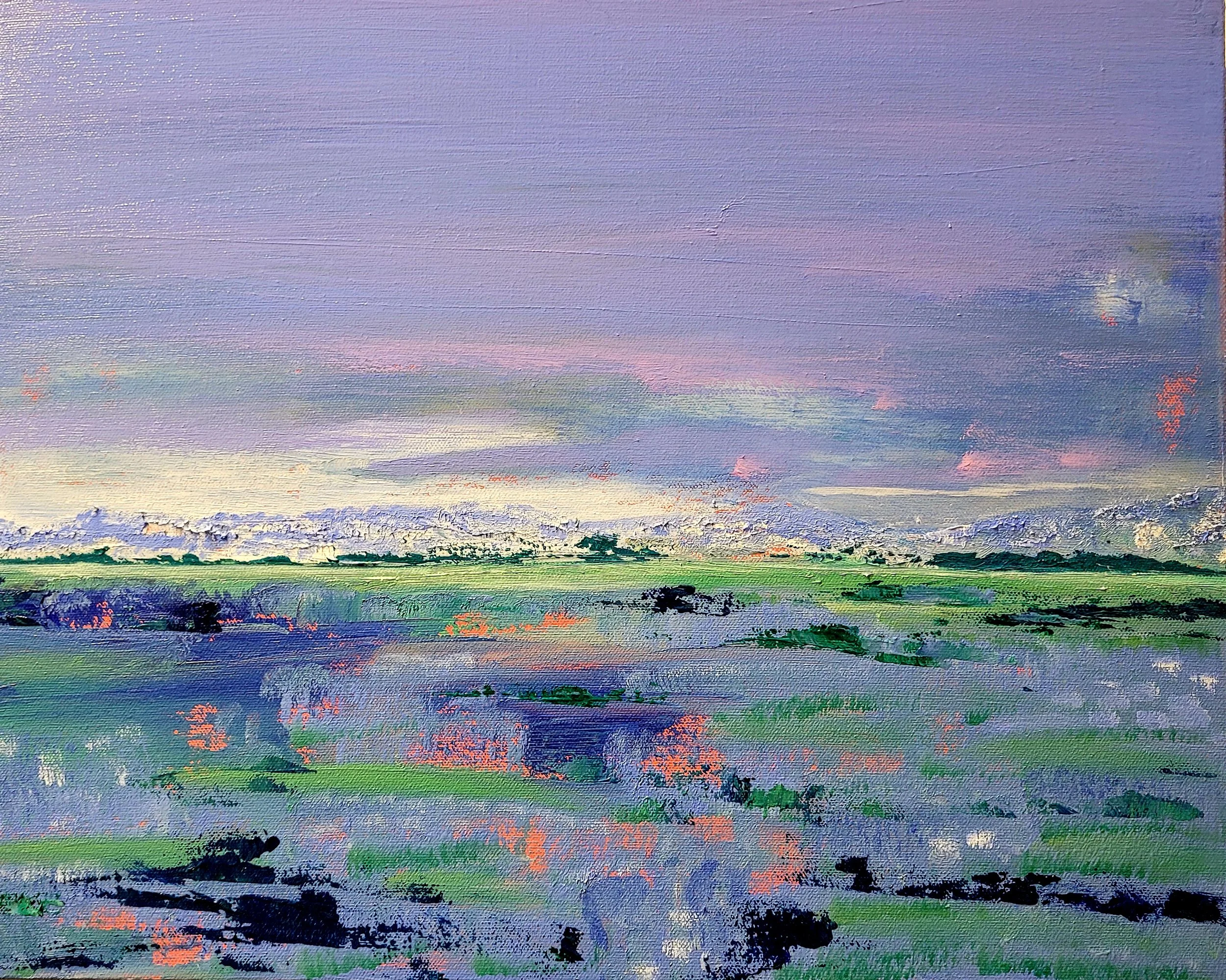 Mountain air has a mystical effect on the air and light. I often feel like I am seeing colors that are off the spectrum. What do we call blue that is just beyond any blue we've previously known? Rather than trying to name it, I let the waves of color and light affect me on a sensory level. My intention in this piece is to share that experience with the viewer.